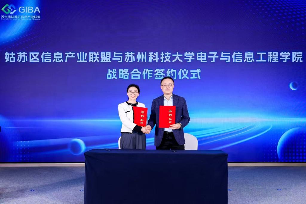 会上,电子学院与姑苏区信息产业联盟正式签署战略合作协议。学院将与姑苏区信息产业联盟开展全方位务实合作:一是以党建共建为引领,搭建信息领域党建联动平台,以党建促合作、促发展;二是以人才培养为核心,联合举办专场招聘会,拓宽学生就业实践渠道;三是以产教融合为抓手,深化产学研协同创新,推动学科建设与产业需求同频共振。