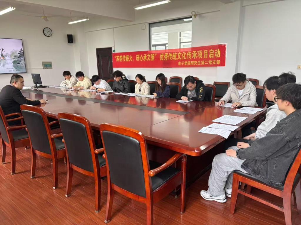 为深入贯彻落实中华优秀传统文化传承发展工程,扎实推进中华优秀传统文化传承发展工作,切实增强青年党员文化自信与使命担当。4月23日下午,电子与信息工程学院研究生第二党支部“苏韵传薪火,研心承文脉”中华优秀传统文化传承实践启动仪式顺利举行,支部全体党员、预备党员及入党积极分子参与活动。